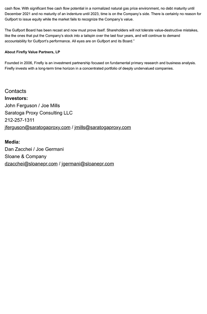 On behalf of our client, Gulfport Energy Corporation (the “Company”), we respectfully advise the staff of the Division of Corporation Finance of the Securities and Exchange Commission of the June 2, 2020 press release issued by Firefly Value Partners, LP (“Firefly”) (attached hereto as Exhibit A), announcing Firefly’s withdrawal of its director nominations for the Company’s 2020 Annual Meeting of Stockholders (the “Annual Meeting”). In light of this withdrawal, the Company intends to revise its preliminary proxy statement for the Annual Meeting to remove references to Firefly’s solicitation in opposition to the Company’s director candidates at the Annual Meeting, including the disclosures required under Rule 14a-12(c) of the Exchange Act.