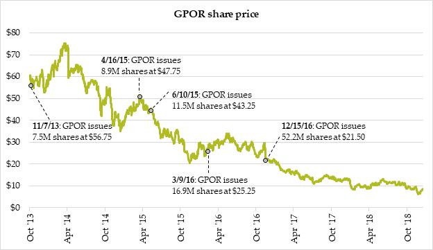 From November 2013 to the present, Gulfport has increased its shares outstanding from roughly 78 million to 173 million, in large part to finance acquisitions. These share issuances have been extremely dilutive, reducing stockholders’ share of valuable acreage and future cash flows. Even though Gulfport has issued approximately $2.9 billion of equity since 2013, its current market capitalization is only $1.5 billion.4 This is stockholder value destruction in the starkest possible terms.