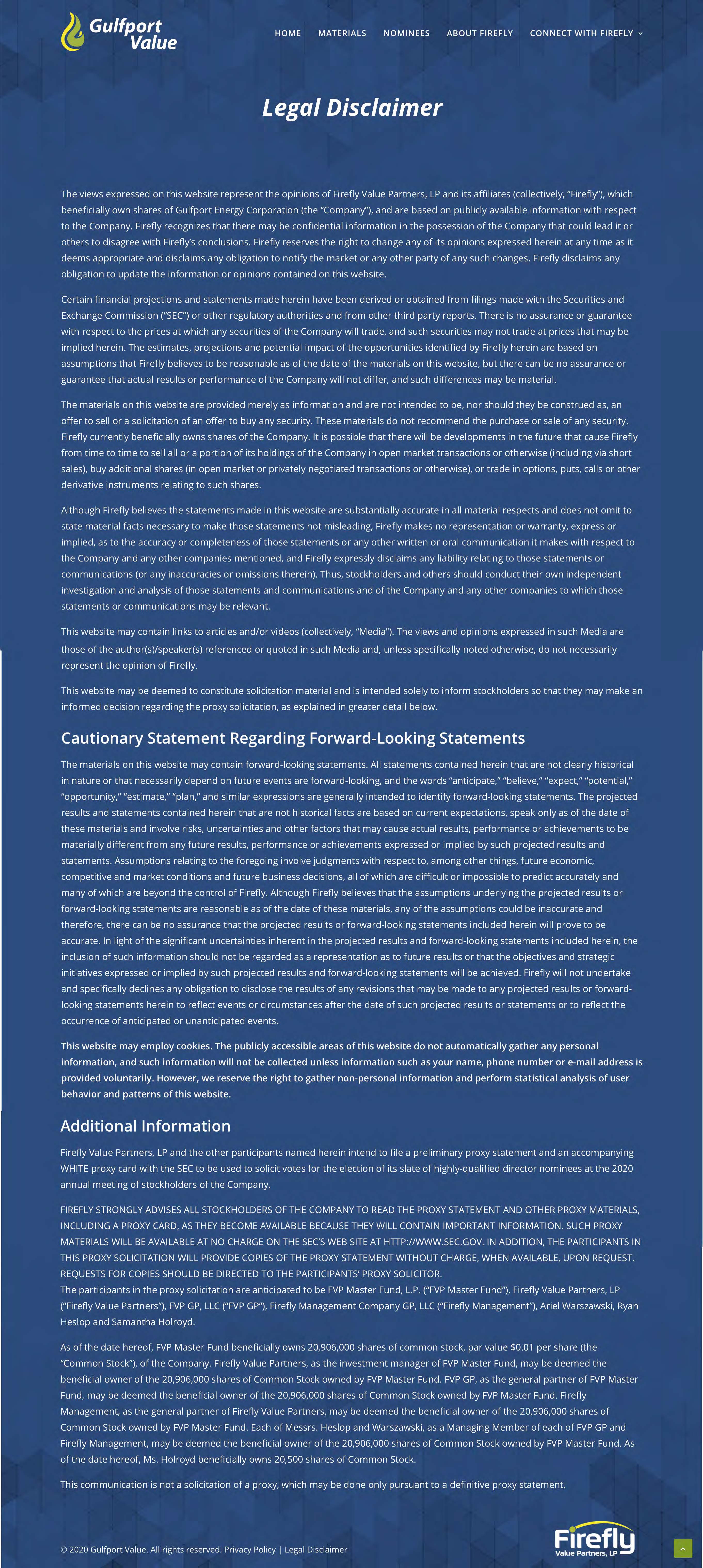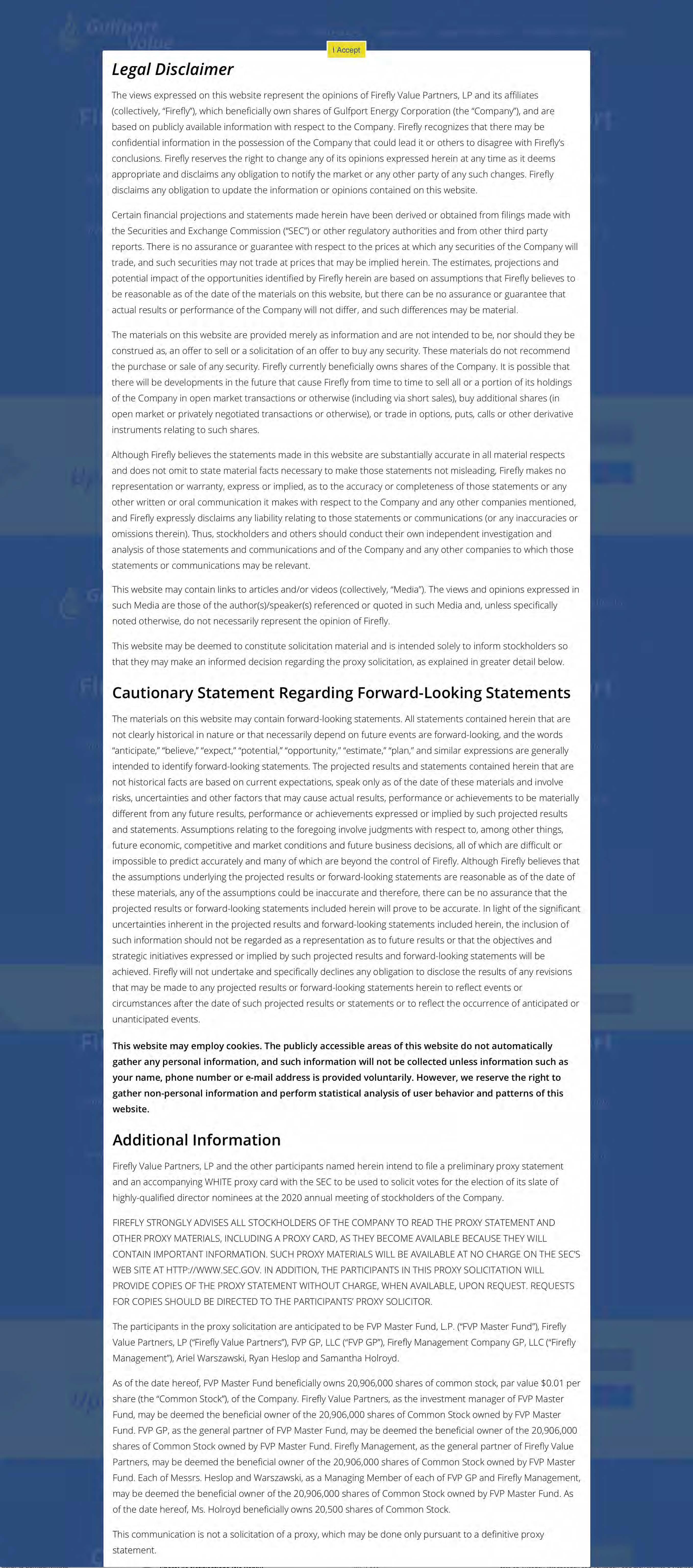 On April 20, 2020, Firefly posted the following materials to www.gulfportvalue.com: