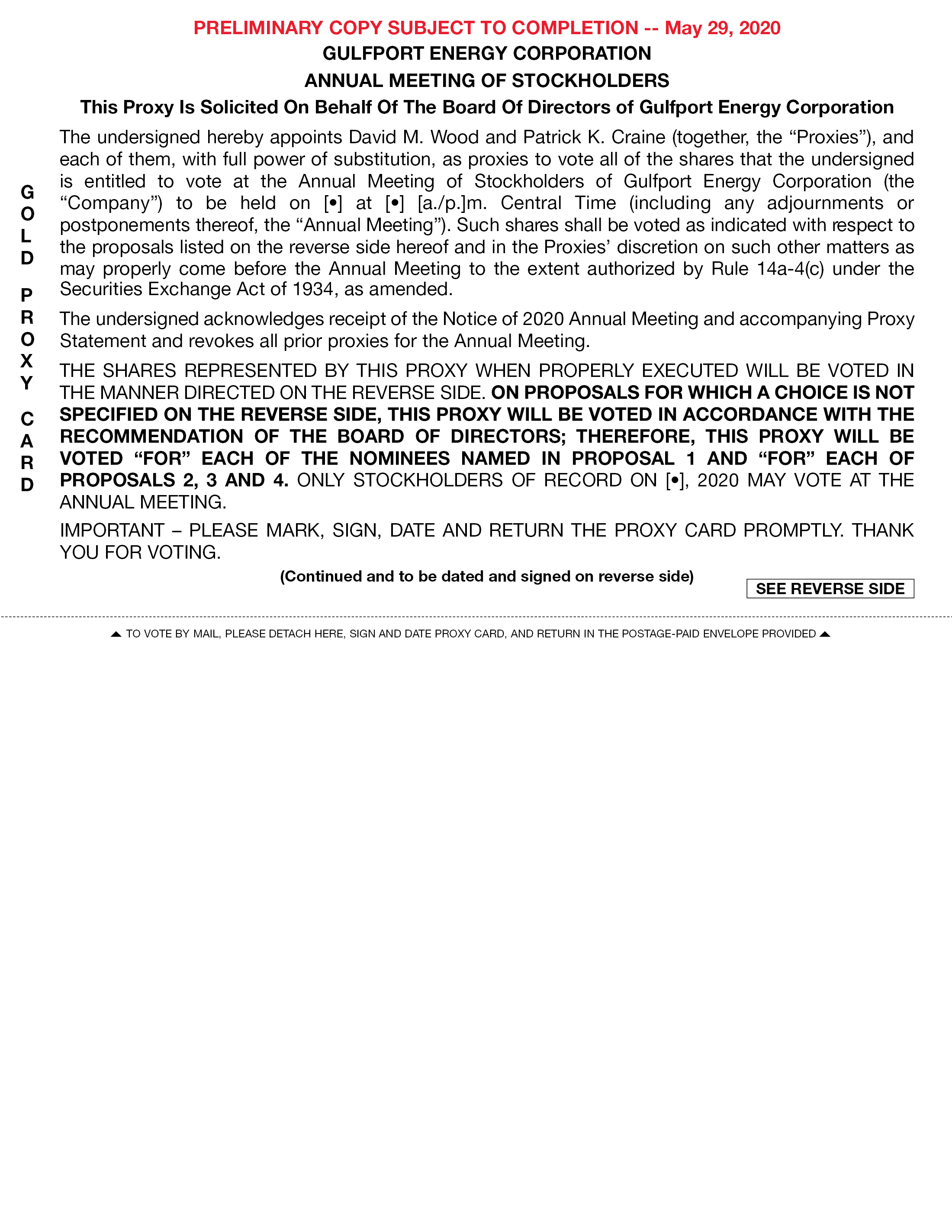 3001 Quail Springs Parkway [X], 2020 Notice is hereby given that the 2020 Annual Meeting of Stockholders (including any adjournments or postponements thereof, the “Annual Meeting) of Gulfport Energy Corporation, a Delaware corporation (the “Company”) will be held on [X], 2020 at [X] [a./p.]m., Central Time at the location listed in the table below and to vote on the proposals listed in the same table. It is important that your voice be heard, and your shares be represented at the Annual Meeting whether or not you are able to attend in person. We urge you to vote TODAY by completing, signing and dating the enclosed GOLD proxy card and promptly mailing it in the enclosed, postage pre-paid envelope provided or following the instructions on the enclosed GOLD proxy card to vote by the Internet or telephone. If your bank, broker or other nominee is the holder of record of your shares (i.e., your shares are held in “street name”), you will receive voting instructions from such holder of record. You must follow those instructions in order for your shares to be voted. Because of the contested nature of the Annual Meeting, if you do not give instructions to your broker, your broker will not be able to vote your shares with respect to any of the proposals. Please refer to the section entitled “About the Annual Meeting” on page [79] of the attached proxy statement and the instructions on the GOLD proxy card for more information. We urge you to vote your shares or to instruct your bank, broker or other nominee to vote your shares “FOR” each of the proposals listed on the enclosed GOLD proxy card. The accompanying proxy statement provides detailed information about the matters to be considered at the Annual Meeting. As you may know, Firefly Value Partners, LP and certain of its affiliates and associates (collectively, “Firefly”) have notified us of their intent to nominate [two nominees] for election as directors at the Annual Meeting in opposition to [two] of the eight nominees recommended by our Board of Directors. You may receive proxy solicitation materials and a white proxy card from Firefly. The Company is not responsible for the accuracy of any information provided by or relating to Firefly or their nominees contained in solicitation materials filed or disseminated by or on behalf of Firefly or any other statements that Firefly may make. The Board strongly recommends that you NOT sign or return any proxy card sent to you by Firefly. If you have previously voted using a white proxy card sent to you by Firefly, you can subsequently revoke that proxy by following the instructions on the enclosed GOLD proxy card. Only your latest dated proxy will count. THE BOARD UNANIMOUSLY RECOMMENDS VOTING “FOR” THE ELECTION OF THE BOARD’S NOMINEES UNDER PROPOSAL 1 AND “FOR” EACH OF PROPOSALS 2, 3 AND 4 USING THE ENCLOSED GOLD PROXY CARD. THE BOARD URGES YOU NOT TO SIGN, RETURN OR VOTE ANY WHITE PROXY CARD SENT TO YOU BY FIREFLY. |