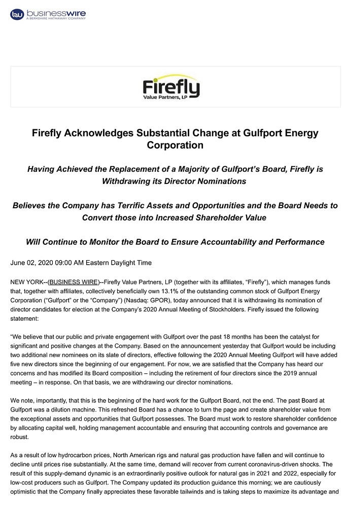 On behalf of our client, Gulfport Energy Corporation (the “Company”), we respectfully advise the staff of the Division of Corporation Finance of the Securities and Exchange Commission of the June 2, 2020 press release issued by Firefly Value Partners, LP (“Firefly”) (attached hereto as Exhibit A), announcing Firefly’s withdrawal of its director nominations for the Company’s 2020 Annual Meeting of Stockholders (the “Annual Meeting”). In light of this withdrawal, the Company intends to revise its preliminary proxy statement for the Annual Meeting to remove references to Firefly’s solicitation in opposition to the Company’s director candidates at the Annual Meeting, including the disclosures required under Rule 14a-12(c) of the Exchange Act.