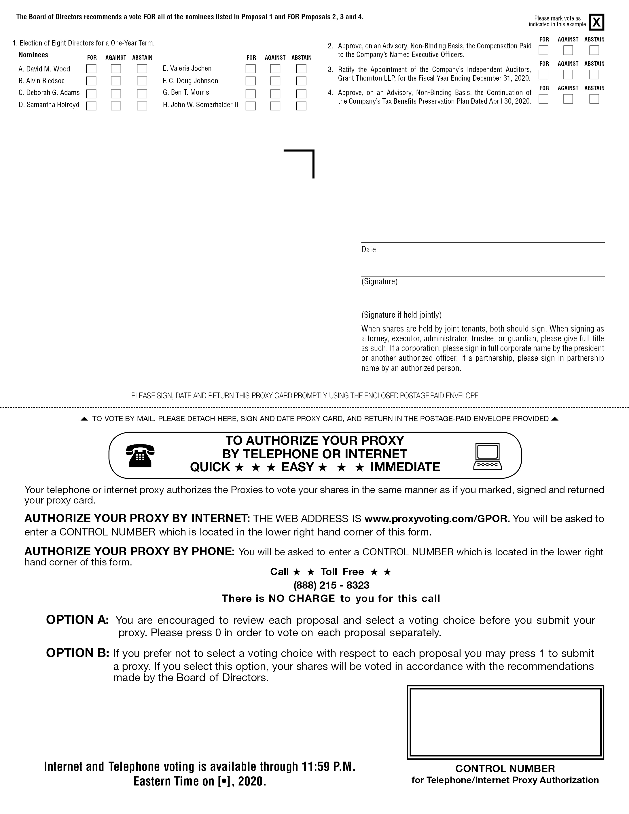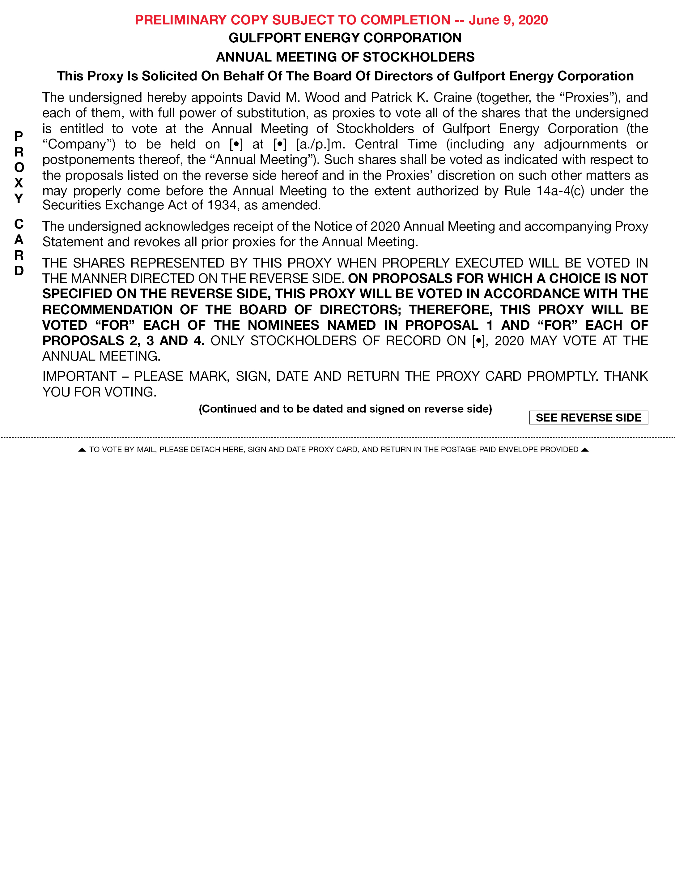 3001 Quail Springs Parkway [X], 2020 Notice is hereby given that the 2020 Annual Meeting of Stockholders (including any adjournments or postponements thereof, the “Annual Meeting”) of Gulfport Energy Corporation, a Delaware corporation (“Gulfport” or the “Company”) will be held on [X], 2020 at [X] [a./p.]m., Central Time at the location listed in the table below and to vote on the proposals listed in the same table. It is important that your voice be heard, and your shares be represented at the Annual Meeting whether or not you are able to attend in person. We urge you to vote TODAY by completing, signing and dating the enclosed proxy card and promptly mailing it in the enclosed, postage pre-paid envelope provided or following the instructions on the enclosed proxy card to vote by the Internet or telephone. If your bank, broker or other nominee is the holder of record of your shares (i.e., your shares are held in “street name”), you will receive voting instructions from such holder of record. You must follow those instructions in order for your shares to be voted. Please refer to the section entitled “About the Annual Meeting” on page [79] of the attached proxy statement and the instructions on the enclosed proxy card for more information. The accompanying proxy statement provides detailed information about the matters to be considered at the Annual Meeting. THE BOARD OF DIRECTORS UNANIMOUSLY RECOMMENDS VOTING “FOR” THE ELECTION OF THE BOARD’S NOMINEES UNDER PROPOSAL 1 AND “FOR” EACH OF PROPOSALS 2, 3 AND 4. In addition to the formal items of business to be brought before the Annual Meeting, there will be a report on our operations and a question and answer period. If you have any questions or require any assistance with voting your shares, please contact our proxy solicitor: Morrow Sodali LLC Email: GPOR@investor.morrowsodali.com |