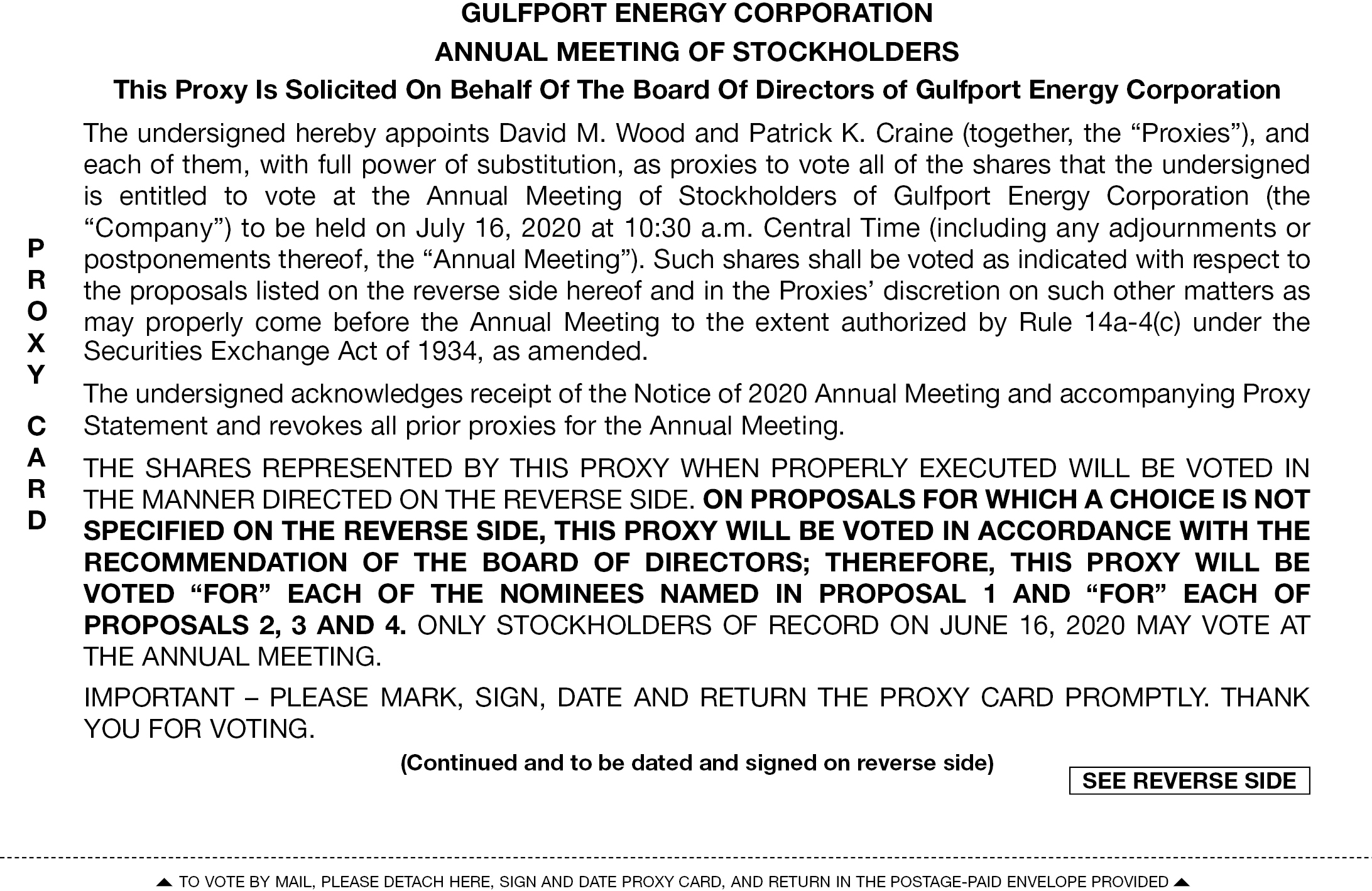IMPORTANT NOTICE REGARDING THE AVAILABILITY OF PROXY MATERIALS FOR THE ANNUAL MEETING OF STOCKHOLDERS TO BE HELD ON JULY 16, 2020: This proxy statement and the Company’s 2019 Annual Report to Stockholders are available free of charge on the Company’s website at www.gulfportenergy.com/proxy.