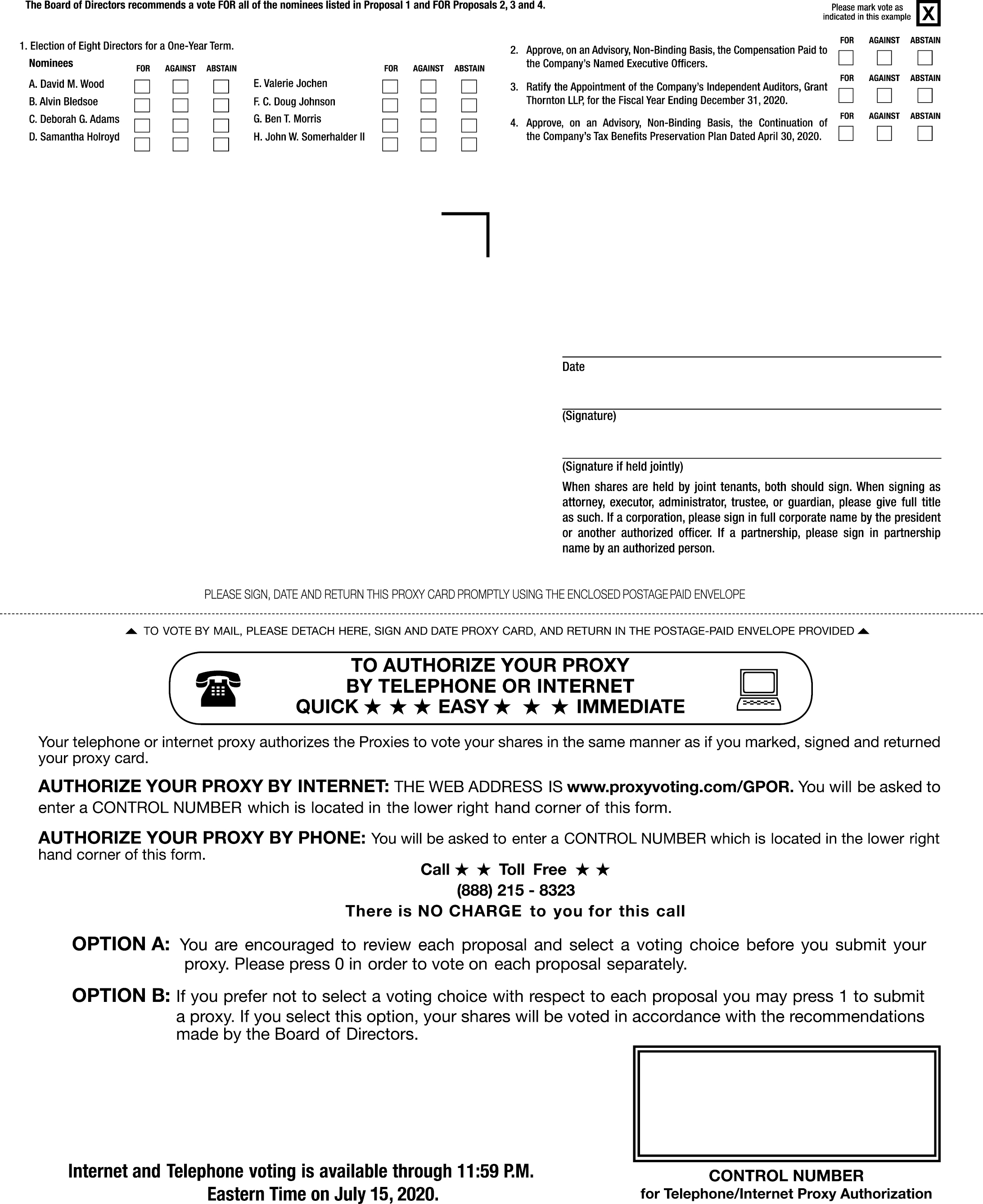 1. To elect eight directors to serve until the Company’s 2021 Annual Meeting of Stockholders or until their respective successors have been duly elected and qualified (the Election of Directors Proposal or Proposal 1); 2. To approve, on an advisory, non-binding basis, on the compensation paid to the Company’s named executive officers (the Say on Pay Proposal or Proposal 2); 3. To ratify the appointment of Grant Thornton LLP as the Company’s independent auditors for the fiscal year ending December 31, 2020 (the Auditors Ratification Proposal or Proposal 3) and 4. To approve, on an advisory, non-binding basis, the continuation of the Company’s Tax Benefits Preservation Plan dated April 30, 2020 (the Tax Benefits Preservation Plan Proposal or Proposal 4). We will also transact any other business as may properly come before the Annual Meeting. |