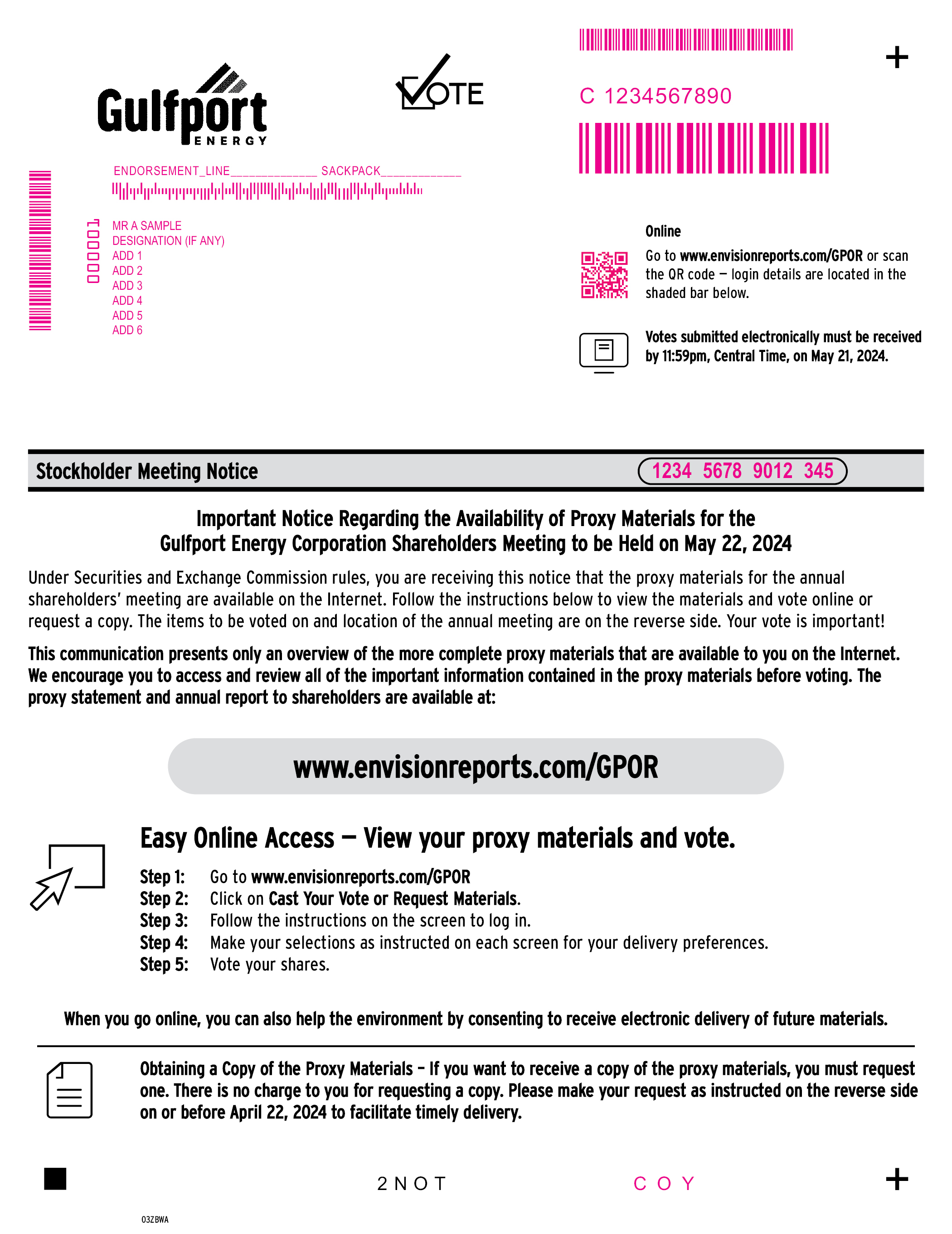 C 1234567890 ENDORSEMENT_LINE SACKPACK MR A SAMPLE DESIGNATION (IF ANY) ADD 1 ADD 2 ADD 3 ADD 4 ADD 5 ADD 6 000001 Online Go to www.envisionreports.com/GPOR or scan the QR code — login details are located in the shaded bar below. Votes submitted electronically must be received by 11:59pm, Central Time, on May 21, 2024. Stockholder Meeting Notice 1234 5678 9012 345 Important Notice Regarding the Availability of Proxy Materials for the Gulfport Energy Corporation Shareholders Meeting to be Held on May 22, 2024 Under Securities and Exchange Commission rules, you are receiving this notice that the proxy materials for the annual shareholders’ meeting are available on the Internet. Follow the instructions below to view the materials and vote online or request a copy. The items to be voted on and location of the annual meeting are on the reverse side. Your vote is important! This communication presents only an overview of the more complete proxy materials that are available to you on the Internet. We encourage you to access and review all of the important information contained in the proxy materials before voting. The proxy statement and annual report to shareholders are available at: www.envisionreports.com/GPOR Easy Online Access — View your proxy materials and vote. Step 1: Go to www.envisionreports.com/GPOR Step 2: Click on Cast Your Vote or Request Materials. Step 3: Follow the instructions on the screen to log in. Step 4: Make your selections as instructed on each screen for your delivery preferences. Step 5: Vote your shares. When you go online, you can also help the environment by consenting to receive electronic delivery of future materials. Obtaining a Copy of the Proxy Materials – If you want to receive a copy of the proxy materials, you must request one. There is no charge to you for requesting a copy. Please make your request as instructed on the reverse side on or before April 22, 2024 to facilitate timely delivery. 2 N O T C O Y 03ZBWA